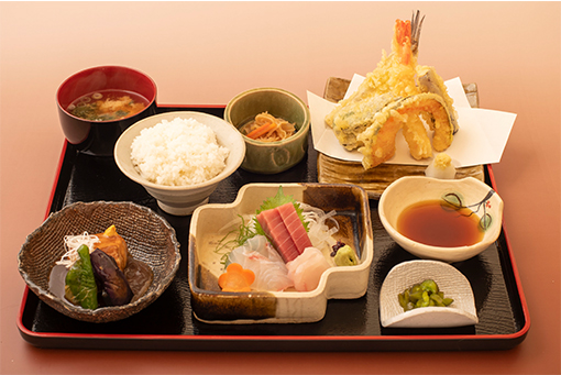 華御膳(刺身・天ぷら・煮物・小鉢・香の物・ご飯・汁物)